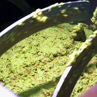 Em seguida são encaminhadas para a moagem, onde um moinho de martelos transforma os frutos inteiros em uma pasta, que é enviada a uma batedora, onde é submetida a um processo de homogeneização a frio.
